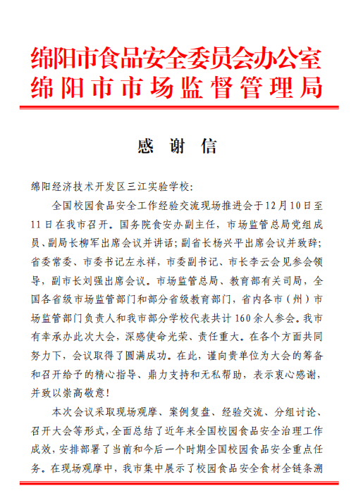 2025年12月10日,全国校园食物平安现场推进会正在绵阳召开。我校凭仗正在义务落实、工做机制、聪慧监管方面的显著成效,从全国浩繁学校中脱颖而出,被保举为全国现场示范不雅摩点(全国仅两所学校获此殊荣,三江尝试学校做为现场示范不雅摩点,深圳二高正在会上做经验交换)。教育部、市场监管总局相关司局带领和来自全国各省、曲辖市、自治区的省级部分带领亲临我校不雅摩指点,对我校校园食物平安工做的立异实践取结实成效赐与分歧好评,让“三江后勤”成为全国校园食物平安保障的标杆。