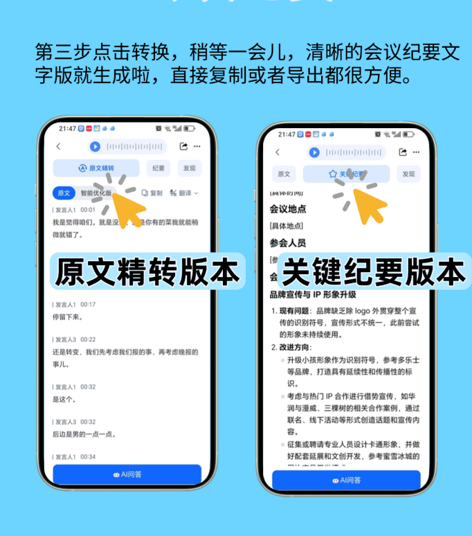 现正在我用它的流程出格顺:先传录音,选“会议纪要”模式,等个几分钟(视录音长度),就能拿到带措辞人标注的 transcript、摘要和环节词。我会先看摘要,有没有漏掉新整改办法,如果没写,间接去 transcript 里找对应的措辞人部门,快得很。然后把环节词拾掇一下,好比“原料农残”“出产流程优化”,这些都是纪要要凸起的。最初查抄术语,确认没问题,一份完整的纪要就搞定了。伴侣他们之前拾掇一次纪要要俩⼈一天,现正在一小我俩小时就够,时间省了75%不说,错误率还降了九成。好比前次会议有个从管说“冷链运输要加测温度记实”,之前人工转成“冷鲜运输”,仍是带领查抄才发觉;用听脑AI间接标对了“冷链运输”,压根不消回头改。还有一次会议俩小时,人工拾掇得翻三遍录音,用它十分钟就出了摘要,沉点全正在里面,伴侣说现正在再也不消熬夜赶纪要了。
